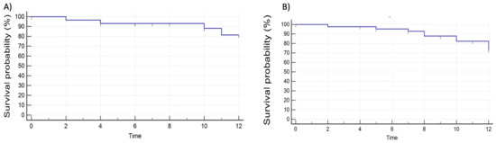 In the first 6 months, 3/72 patients (4.2%) discontinued therapy: two due to secondary failure, and one due to side effects. During the following 6 months, 6/69 patients (8.7%) discontinued therapy: three for secondary failure, two due to side effects, and one due to pregnancy. Figure 5 shows the Kaplan–Meier curve of the therapy persistence in the patients starting with GP2017 (Figure 5A) and in patients switching from another adalimumab (Figure 5B). The percentages of therapy persistence are similar in patients starting GP2017 as their first therapy and in patients starting GP2017 as a switch from another adalimumab.
