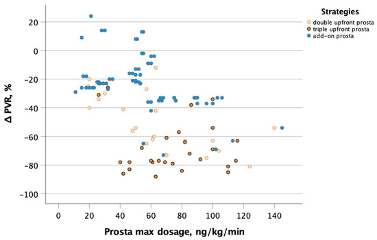 The maximum dosage of parenteral prostanoids achieved before the second evaluation was associated at univariate analysis with the increased odds of achieving the greater tertile of PVR changes, showing a 26% increase in the likelihood of PVR reduction greater than 9 WU for every additional increase of 10 ng/kg/min in dosage (OR 1.26, 95% C.I. 1.12–1.40, p < 0.001). However, in multivariate analysis, the treatment strategy emerged as more important (independently associated) than the maximum dosage. As shown in Figure 2, the up-titration to a higher dosage seems more important for the add-on strategy and upfront with one oral drug strategy compared with the triple upfront one.