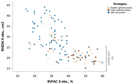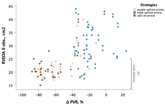 Figure 3 shows the tight relationship between PVR reduction and RVEDA at the second observation. The improvement to a mild RV dilation is clearly a function of the ability of the treatment strategy to achieve a greater reduction of PVR at last observation. The triple upfront combination with parenteral prostanoid emerged as the strategy with the higher likelihood of achieving a mild RV dilation compared with the add-on strategy to oral drugs (triple upfront: OR 13.6, 95% C.I. 4.2–43.9, p = 0.0001; one oral drug plus parenteral prostanoid: OR 5.1, 95% C.I. 1.9–13.5, p = 0.001).