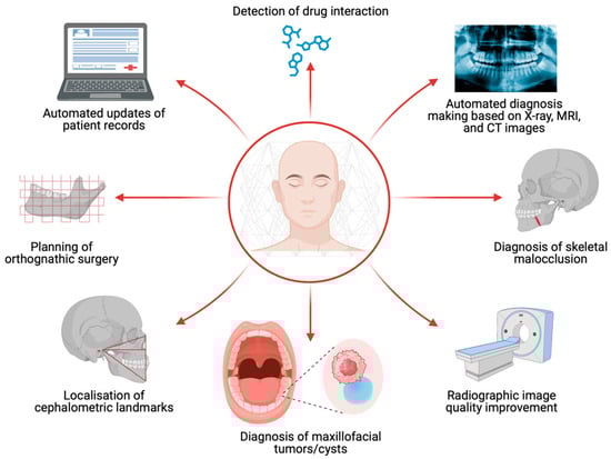 AI has also found application in robotic surgery, within the field of OMFS. AI-aided cranial surgical procedures, including dental implants, tumor resection, biopsies, and temporomandibular joint surgery, have demonstrated successful outcomes [,,,]. Research has shown that AI-aided surgery improved the accuracy and safety of oral implant procedures compared to traditional freehand techniques. Specifically, the use of AI reduced the need for revision surgeries and implant repositioning in some cases []. Furthermore, AI-aided approaches enabled more precise surgical resection of tumors and cysts, minimizing the requirement for additional procedures []. Distinct AI applications within the field of OMFS are depicted in Figure 2. Table 1 demonstrates the unique modalities that AI can be utilized through to aid in OMFS.