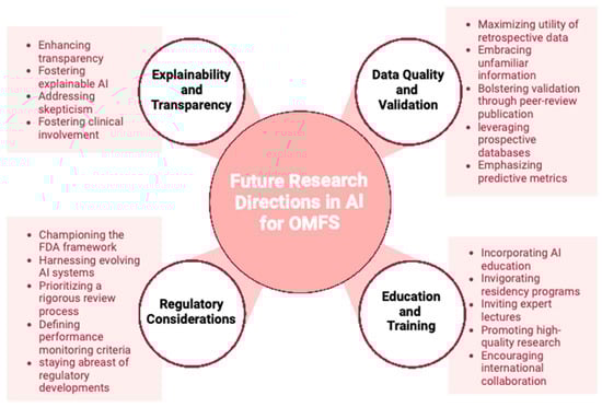 It is recommended that OMFS residency programs incorporate essential AI curricula into their educational offerings to enhance understanding of AI models and algorithms. Program directors can invite healthcare AI experts to give lectures at a fundamental, clinical level. By doing so, residents can safely integrate AI technologies into their practice and critically evaluate models for their application. OMFS residents should be encouraged to contribute high-quality, prospective research during their training to improve future AI models. By basing AI models on more predictable future databases, the field can smoothly transition to AI use when it becomes a standard treatment. Collaboration among OMFS surgeons on an international level can generate high-quality AI training data from diverse patient populations, ensuring their continued important role in the utilization and innovation of AI in the maxillofacial region.