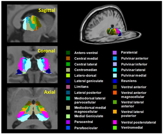 The thalamic subnuclei were calculated using the FreeSurfer v7.2 software (MGH, Boston, MA, USA). Automated parcellation and segmentation of the cortical and subcortical brain areas in the T1 images were performed using the standard pipeline in FreeSurfer [43]. Post-processing of T1 images included the following steps: correction for head motion and non-uniformity of intensity, the Talairach transformation of each subject’s brain, the removal of non-brain tissue, the segmentation of cortical GM, subcortical WM, and deep GM volumetric structures, the triangular tessellation of the GM/WM interface and the GM/CSF boundary, and topological correction [43]. We focused on the thalamus and thalamic subnuclei to test our prediction that we would observe reductions in the thalamus of women with AD. Two ROIs in the thalamus and 50 ROIs in the thalamic subnuclei were extracted from each hemisphere of the subjects’ T1 images via the FreeSurfer automated parcellation procedure. Twenty-five thalamic subnuclei (50 ROIs) were extracted from the left and right hemispheres, including the anteroventral (AV), laterodorsal (LD), lateral posterior (LP), ventral anterior (VA), ventral anterior magnocellular (VAmc), ventral lateral anterior (VLa), ventral lateral posterior (VLp), ventral posterolateral (VPL), ventromedial (VM), central medial (CeM), central lateral (CL), paracentral (Pc), centromedian (CM), parafascicular (Pf), paratenial (Pt), reuniens/medial ventral (MV-re), mediodorsal medial magnocellular (MDm), mediodorsal lateral parvocellular (MDl), lateral geniculate (LGN), medial geniculate (MGN), limitans/suprageniculate (L-SG), pulvinar anterior (PuA), pulvinar medial (PuM), pulvinar lateral (PuL), and pulvinar inferior (PuI) regions (Figure 1). Each thalamic subnucleus was used to evaluate the adjusted volume using the following equation: