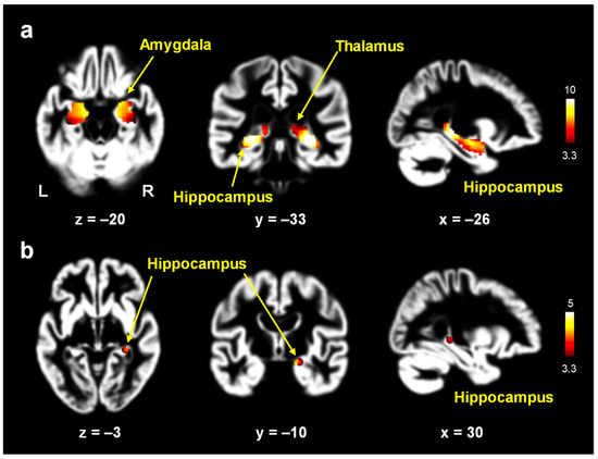 Brain areas with decreased gray matter volumes in women with Alzheimer’s disease (AD) relative to postmenopausal women: multivariate analyses of variance with whole brain volume as a covariate (a) and multivariate analyses of variance with whole brain volume and age as covariates (b). The color-coded pixels were scaled to the range (t-value) more than the cutoff threshold (p < 0.05). In the voxel-wise analysis, women with AD showed significantly lower gray matter volumes in the hippocampus, thalamus, and amygdala (p < 0.05, FWE-corrected) (a). After adjusting for age, women with AD showed significantly lower gray matter volumes in the hippocampus (p < 0.05, FWE-corrected) (b). L: left; R: right.