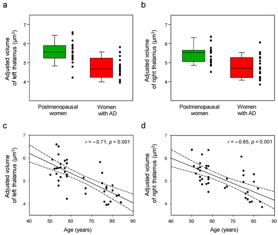 Box and scatter plots for the adjusted volumes of the left (a) and right (b) thalamus (raw values, uncorrected for age) and correlation plots between age and the adjusted volumes of the left (c) and right (d) thalamus in postmenopausal women vs. women with Alzheimer’s disease (AD). Although women with AD showed volume atrophy in the bilateral thalamus compared with postmenopausal women, no significant volume differences were found between the two groups after adjusting for age (a,b). Age was negatively correlated with the adjusted volume of the left (r = −0.71, p < 0.001) and right (r = −0.65, p < 0.001) thalamus, respectively (c,d). The black dots in the scatter plots (c,d) represent individual data points, showing the adjusted thalamic volume for each subject at different ages. Dotted lines show 95% confidence intervals (c,d).
