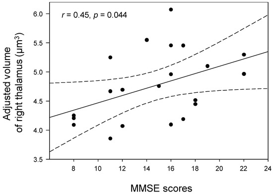 Correlations between adjusted volumes of the right thalamus and MMSE scores in women with AD. The MMSE scores in women with AD were positively correlated with adjusted right thalamic volumes (r = 0.45, p = 0.044). The black dots in the scatter plots represent individual data points, showing the adjusted volume of right thalamus for each subject at different MMSE scores. Dotted lines show 95% confidence intervals. MMSE: Mini−Mental State Examination.