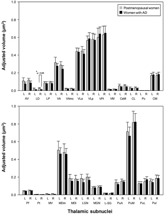 Thalamic subnuclear volumes in postmenopausal women vs. women with Alzheimer’s disease (AD). Women with AD showed significantly reduced volume in the right laterodorsal thalamic nucleus compared to postmenopausal women. L: left; R: right; AV: anteroventral; LD: laterodorsal; LP: lateral posterior; VA: ventral anterior; VAmc: ventral anterior magnocellular; VLa: ventral lateral anterior; VLp: ventral lateral posterior; VPL: ventral posterolateral; VM: ventromedial; CeM: central medial; CL: central lateral; Pc: paracentral; CM: centromedian; Pf: parafascicular; Pt: paratenial; MV-re: reuniens (medial ventral); MDm: mediodorsal medial magnocellular; MDl: mediodorsal lateral parvocellular; LGN: lateral geniculate; MGN: medial geniculate; L-SG; limitans (suprageniculate); PuA: pulvinar anterior; PuM: pulvinar medial; PuL: pulvinar lateral; PuI: pulvinar inferior. * Met the Bonferroni-corrected significance level.