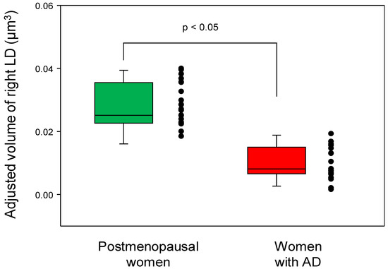 Box and scatter plots for the adjusted volumes of the right laterodorsal thalamic nucleus (LD) in postmenopausal women vs. women with Alzheimer’s disease (AD). Women with AD exhibited significantly reduced volume in the right laterodorsal nucleus of the thalamus compared with postmenopausal women; this result was obtained from a multivariate analysis of variance with age as a covariate (p < 0.05, Bonferroni-corrected). The black dots alongside each box plot represent individual data points from participants within each group, showcasing the variation in adjusted volumes of the right LD.