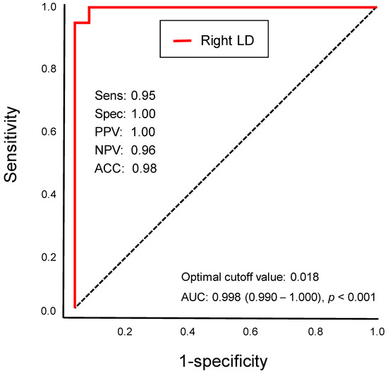 Receiver operating characteristic (ROC) curve of the adjusted volume of the right laterodorsal thalamic nucleus (LD) for the diagnosis of Alzheimer’s disease (AD): the sensitivity (Sens), specificity (Spec), positive predictive value (PPV), negative predictive value (NPV), accuracy (ACC), cutoff value, and area under the ROC curve (AUC) of the adjusted right LD volumes for diagnosing AD were 0.95, 1.00, 1.00, 0.96, 0.98, 0.018, and 0.998 (95% confidence interval: 0.990–1.000), respectively.