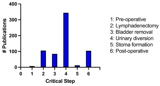 We utilized the critical steps identified to undertake a comprehensive search of the literature between the years of 2013–2023 using the critical steps as keywords. We recorded the number of publications during this 10-year period with the following results: (1) preoperative considerations = 7; (2) lymphadenectomy = 105; (3) bladder removal = 84; (4) urinary diversion = 347; (5) stoma formation = 12; (6) postoperative considerations = 104 (Figure 2).