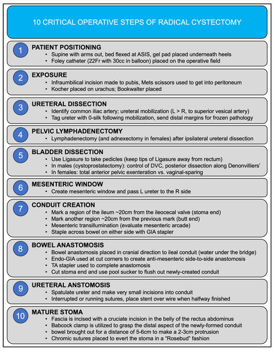 This study provides a comprehensive analysis of the essential procedural elements involved in open RC. The primary objective of this study was to establish a concise evidence-based resource for surgeons learning and optimizing their surgical techniques in this domain. For those in training or studying this surgery, the “Summary for the 10 Critical Operative Steps of Radical Cystectomy” depicted in Figure 2 may be useful. This succinct one-page guide encapsulates the key principles and methodological aspects of RC for open surgery as an additional reference.