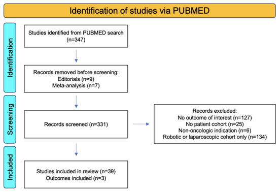 Using the search criteria “(bladder cancer) AND (open radical cystectomy) AND (urinary diversion)”, we conducted a systematic review of the literature from 2013–2023 with the primary outcomes of overall survival (OS), total 90-day complications, and major 90-day complications. A total of 347 studies were identified using this search criteria. Out of these, 30 were prospective clinic trials. Editorials (n = 8) and meta-analyses (n = 7) were removed from the search and a total of 331 studies were screened. Excluded studies included those that did not include the outcome of interest (n = 127), those with no patient cohort (n = 25), those that involved cystectomies completed for non-oncologic indications (n = 6), and those that included only robotic and/or laparoscopic patient cohorts (n = 134). This resulted in 34 total studies which were included in the systematic review (Figure 4).