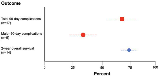 Using these criteria, we found that the 2-year OS for RC was 73.3% ± 8.1% (n = 14 studies, 2870 total patients), the total 90-day complication rate for RC was 70.6% ± 14.4% (n = 17 studies, 3246 total patients), and the major 90-day complication rate for RC was 32.7% ± 15.8% (n = 9 studies, 1699 total patients) (Figure 5).