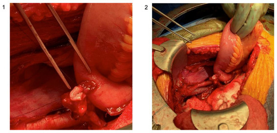 Set-up of the uretero-intestinal anastomosis with ureteral and bowel mucosal apposition; (1) zoomed-in photo with attention to the suture placement; (2) zoomed-out photo with attention to the surgical set-up (original images; courtesy: Dr. Matthew Mossanen).
