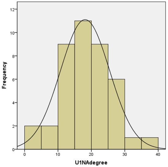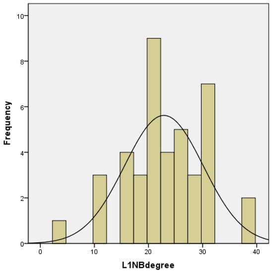 The morphological characteristics of this anomaly in patients of this group had significant differences. The sagittal incisive fissure, characteristic of a distal occlusion, was absent due to the palatal inclination of the upper incisors in 25 (60.98%) patients. Cephalometric assessment of upper incisor inclination showed a range of 36° for U1NA/deg (mean 18.11°, SD 7.365°). The lower incisor inclination ranged within 38° (mean 22.8°, SD 7.28°). In 14 (34.15%) cases, protrusion of the upper incisors was observed (Figure 1 and Figure 2).