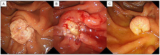 Endoscopic observations were performed at 3, 6, and 12 months after EP and then annually. Histopathological diagnosis was performed using an endoscopic biopsy when papillary redness, swelling, and granular mucosal changes were observed during endoscopic observation, and a residual tumor was suspected (Figure 3). When there were no findings suggestive of a residual lesion, a biopsy was not performed, and endoscopic observation was completed. Residual tumors were defined only in cases where the pathological findings on biopsy were adenoma or adenocarcinoma.