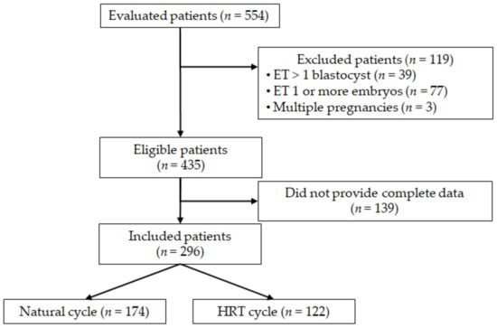A total number of 554 women who had performed FET cycles underwent the first trimester screening test at our hospital and were thus considered for inclusion in the study. Among these, 435 women met the inclusion criteria and were therefore contacted by telephone to obtain the necessary data regarding the IVF cycle. Complete data were not available in 139 cases, who were consequently excluded. Overall, 296 women were included: 174 women underwent natural cycle monitoring, while 122 women received HRT (Figure 1).