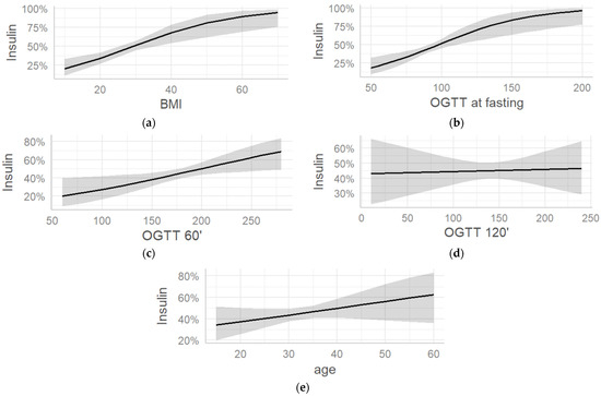 (a) Pre-pregnancy BMI (kg/m2) and the association of insulin therapy; (b) OGTT at fasting (G0; (mg/dL)) and the association of insulin therapy; (c) OGTT 60′ (60 min OGTT, G60, (mg/dL)) and the association of insulin therapy; (d) OGTT 120′ (120 min OGTT, G120, (mg/dL)) and the association of insulin therapy; (e) age and the association of insulin therapy. Marginal effects derived via logistic regression.