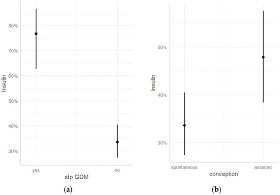 Furthermore, individuals with a prior history of GDM exhibited a significantly greater likelihood of requiring insulin therapy during pregnancy in comparison to those without a previous GDM diagnosis (with rates exceeding 75% and 30%, respectively, as seen in Figure 2a). In cases where pregnancy resulted from assisted reproduction methods, the probability of commencing insulin treatment exceeded 45%, while patients who conceived naturally had a slightly higher than 30% chance of initiating insulin therapy (Figure 2b). Confidence intervals and a logistic regression table of the variables are visualized in Table 2.