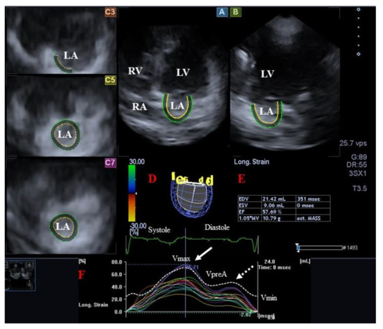 Three-dimensional (3D) speckle-tracking echocardiographic assessment of the left atrium (LA). From the acquired 3D echocardiographic dataset, the following views are created automatically: longitudinal apical four-chamber (A) and two-chamber (B) views are presented together with short-axis views at the basal (C3), midatrial (C5), and superior (C7) LA regions. Virtual 3D model of the LA (D), calculated LA volumetric data (E) and time–LA global (white curve) and segmental (colored curves) longitudinal (F) strain curves with time–LA volume changes curve (dashed white curve) are also presented. White arrow represents peak LA strain, while dotted white arrow represents LA strain at atrial contraction. Abbreviations. LV = left ventricle, LA = left atrium, RV = right ventricle, RA = right atrium, EDV = end-diastolic volume, ESV = end-systolic volume, EF = ejection fraction, MASS = LA muscle mass, Vmax = minimum end-systolic LA volume, VpreA = early diastolic LA volume before atrial contraction, Vmin = end-diastolic minimum LA volume.