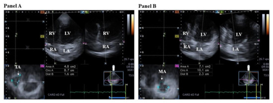 Three-dimensional (3D) speckle-tracking echocardiographic presentation of the two-dimensionally projected views of tricuspid (TA) (panel A) and mitral annuli (MA) (panel B). From the acquired 3D echocardiographic dataset, the following views can be created: apical four-chamber (A) and two-chamber views (B) and a cross-sectional view at the level of the TA/MA optimized in apical four- and two-chamber views (C7). The white arrow represents the TA/MA plane. Abbreviations: LA = left atrium, LV = left ventricle, RA = right atrium, RV = right ventricle, Area = TA/MA area, Circ = TA/MA perimeter, Dist = TA/MA diameter.