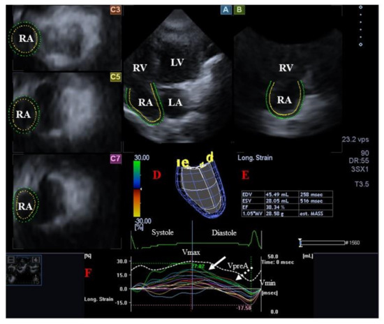 Three-dimensional (3D) speckle-tracking echocardiography-derived evaluation of the right atrium (RA). From the acquired 3D echocardiographic dataset, the following typical views are presented: longitudinal apical four-chamber (A) and two-chamber (B) views and short-axis views at basal (C3) and midatrial (C5) and superior (C7) RA levels. The 3D RA model (D) is seen together with calculated RA volumetric data (E) and time–RA global (white curve) and segmental (colored curves) longitudinal (F) strain curves with time–RA volume changes curve (dashed white curve). White arrow represents peak RA strain, while white dashed arrow represents RA strain at atrial contraction. Abbreviations. LV = left ventricle, LA = left atrium, RV = right ventricle, RA = right atrium, EDV = end-diastolic volume, ESV = end-systolic volume, EF = ejection fraction, MASS = RA muscle mass, Vmax = minimum end-systolic RA volume, VpreA = early diastolic RA volume before atrial contraction, Vmin = end-diastolic minimum RA volume.
