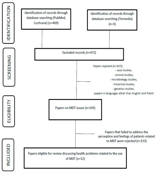 The study employed a qualitative literature review covering the years 2002–2022, using the Medline, PubMed, Cochrane, and Termedia databases. The keywords “maggot debridement therapy”, “acceptance”, “perception”, and “pain” were applied in the literature search to identify the available literature. The databases were analyzed, and 472 duplicates were identified (Figure 1) through manual reference searches of the selected manuscripts. Subsequently, 327 sources that were not directly pertinent to the intended analysis, such as case studies, case series, genetic, microbiological, and animal studies, were excluded. In the subsequent phase, 145 works were selected, encompassing descriptions of potential issues encountered during MDT therapy. Among these, 133 studies were eliminated, as they did not address the specific subjects of interest, namely, acceptance, perception, and health problems. Twelve papers were included in the final analysis, including original articles and randomized trials (see Table 1). The data collection process consisted of two stages. In the first stage, the titles and abstracts of manuscripts in both English and Polish were screened to assess their relevance. Eligible articles were then advanced to the second stage of selection, during which, the full texts were scrutinized to determine their inclusion. This process was carried out by two members of the research team and finally approved by the project leader.