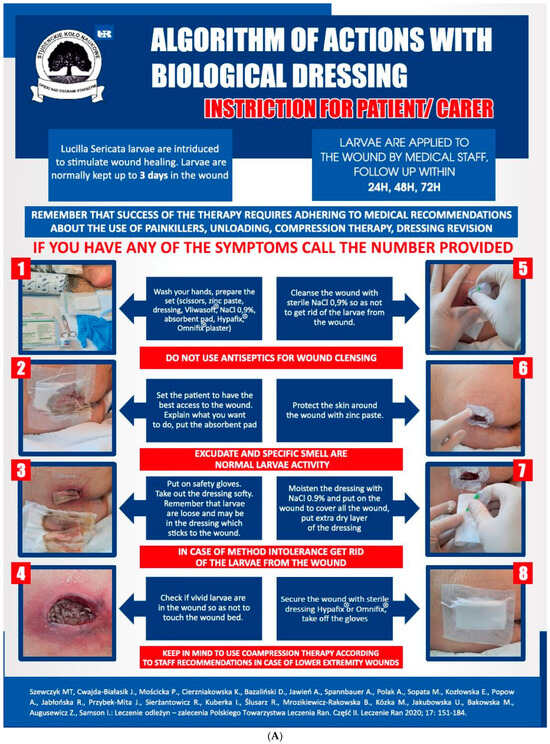 Posters prepared for educational purposes in the wound treatment clinic at the Podkarpackie Oncology Centre: (A) dressing application and supervision process, and (B) action of larval therapy in the wound [8].