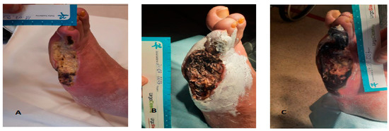Male, 64 years old, with a history of diabetic ischemic neuropathic foot, after limb revascularization: (A): Wound (WIFi 2) before the application of 50 loose larvae, with no bacterial growth in the microbiological assessment, CRP 5 mg/dL, (B): the 2nd day of MDT without complications, and (C): the 3rd day after the removal of the larvae, showing a fever of 39 °C, signs of tissue undermining, and fulminant necrosis, with CRP at 203 mg/dL.