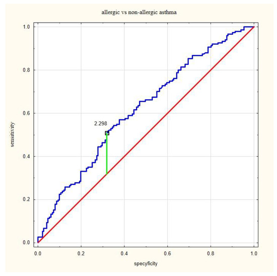 The ROC analysis indicated that proposed cut off differentiating asthmatic and non-asthmatic patients was 0.53 (according to Younden’s method), with a sensitivity of 93% and specificity of 24% (Figure 1). The proposed cut off between allergic and non-allergic asthma was 2.30 with a sensitivity of 51% and specificity of 68% (Figure 2).