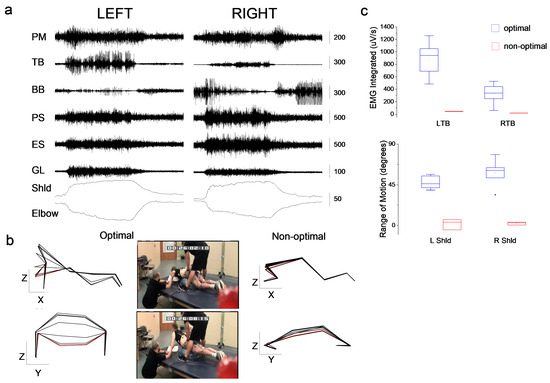 Quantification of motor output during a push-up exercise. (a) Bilateral EMG activity of upper extremity and trunk muscles during a push-up. Left panel: left side muscles and kinematics of the shoulder (Shld) and elbow; right panel shows right side muscles and kinematics. Muscles: pectoralis major (PM); triceps brachii (TB); biceps brachii (BB); paraspinal at T12 (PS); erector spinae (ES); gluteus maximus (GL). (b) Two-dimensional positional kinematic representation of an optimal (elbows supported wide) and non-optimal (elbows pointing posteriorly) push-up positions. A sagittal (X-Z) and frontal (Y-Z) views are shown for both variations. The non-optimal position resulted in an unsuccessful push-up. Photographs represent an optimal attempt. (c) Box plot of integrated EMG for the left triceps brachii (LTB) and right triceps brachii (RTB) during optimal push-up trials (blue box) and non-optimal push-up trials (red-box). Data are from 5 optimal attempts and 3 non-optimal attempts. The right panel is the range of motion of the shoulder for the same data set.