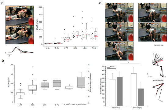 Quantification of motor output during trunk exercises. (a) Box plots of integrated EMG (iEMG) for left (L) and right (R) hip extensors and trunk extensors during a hip bridge exercise. Individual data points are shown to the left of box plot. Stick figure is the representative two-dimension kinematic data in the sagittal plane (X-Z) for one attempt. First frame is shown in red. Muscles: paraspinal at T12 (PS); erector spinae (ES); gluteus maximus (GL). (b) Box plots of integrated EMG (iEMG) for left (L) and right (R) paraspinal muscles during hip bridge exercise performed on a mat (white) and on a Biodex (Gray), data also show range of motion about the hip (flexion/extension) for both positions. (c) Bar graph representing the average and SE of the sum of integrated EMG for upper, lower extremity and trunk flexor muscles (white) and upper, lower extremity and trunk extensor muscles (gray) during two different trunk extension exercises. Each exercise was performed three times. Symbol ** denotes significant difference p < 0.005. The successful attempts had an initial position with upper extremities resting on thighs with the trunk fully flexed forward (photographs to the left and top stick figure). Initial position is shown in red. The unsuccessful attempts had an initial position with upper extremities hanging to the side of the legs with the trunk fully flexed forward (photograph to the right and bottom stick figure). Initial position shown in red.