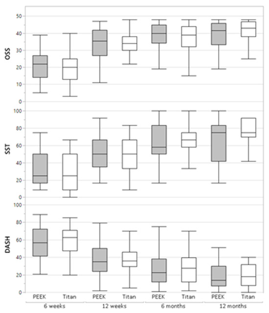 One year post-op, all patients demonstrated a significantly improved functional outcome compared with the previous follow-up examination at 6 weeks, 12 weeks, and 6 months post-op (Table 2 and Table 3). The CFR-PEEK group reached 18.6 ± 14.7 points in the DASH Score, and the titanium group 23.9 ± 22.0 points. Similar results were also seen in the Simple Shoulder Test (71.5 ± 18.2 CFR-PEEK; 71.3 ± 22.8 titanium) and the Oxford Shoulder Score (38.4 ± 12.2 CFR-PEEK; 39.3 ± 8.6 titanium) (Table 2, Figure 1). No significant differences could be identified regarding treatment with the different plates.