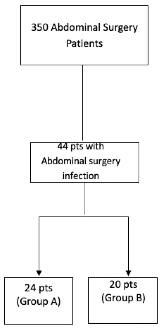 Particularly, the collected data were divided into two groups: Group A patients underwent pentameric IgM plus antibiotics and patients selected from the same cohort of surgical procedures but treated with antibiotics alone comprised Group B (Figure 1). Demographic data and relevant comorbidities were recorded for all patients in terms of laboratory markers and clinical outcomes. According to clinical practice and local guidelines, the following parameters were retrospectively evaluated every 48 h: blood gas analysis, lactate, CRP, procalcitonin, endotoxin activity, liver and renal function, coagulation and blood cell count. Empirical antibiotic treatment was planned for all patients and was based on their legal indications and license of use in Europe and Italy, as well as regional and hospital guidelines, or after infectious disease consultant assessment. Mainly, all empiric treatments in patients with abdominal infections were based on the following schedules: tigecycline + piperacilin/tazobactam, or according to hospital or regional guidelines and their updates (https://www.regione.campania.it/assets/documents/linee-indirizzo-terapia-antibiotica.pdf accessed on 24 August 2023). This therapeutic schedule was modified according to scientific evidence from the infectious disease group in surgery at AORN A. Cardarelli [13] and national/regional guidelines, as well as microbiological isolates when required. Antifungals were used when required according to a previous score system [7] and were based on azoles or liposomal amphotericien B, according to risk factors. The laboratory parameters were evaluated at a centralized laboratory; particularly, CRP and procalcitonin were assessed according to previous evidence [7,13]. Endotoxin activity is measured as the relative oxidative burst of primed neutrophils as detected using chemiluminescence. The assay’s output is expressed on a scale from 0 (absent) to 1 (maximal) and categorized as “low” (<0.4 units), “intermediate” (0.4–0.59 units) or “high” (≥0.6 units). Endotoxin activity assay was performed within one hour of blood collection according to the vacutainer systems (Becton Dickinson, Franklin Lakes, NJ, USA).