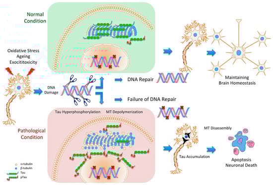 Given what has been mentioned thus far, we suggest a model in which tau favors relocating damaged sites to perinuclear areas through enhanced microtubule polymerization, hence promoting proper DNA repair. High levels of oxidative stress (persistent DNA damage) cause the accumulation of p-tau, which impairs microtubule polymerization and the proper repair of DNA, resulting in cell death by starting a destructive feedback loop (Figure 1) [106,134].