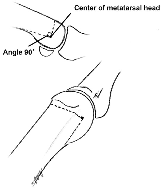 Schematic illustration of the modified technique. We utilized the osteotomy cut (dotted lines) with the angle at 90 degrees. Note that the exit of the transverse arm is located proximally to the capsule and provides a large contact area between the capital fragment and metaphyseal region of the metatarsal bone.