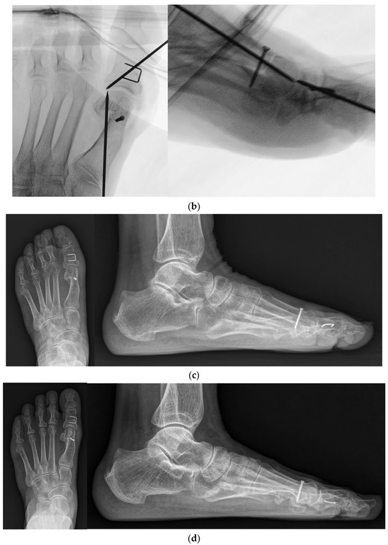 (a) Preoperative standing foot anteroposterior and lateral radiographs; (b) Intraoperative foot anteroposterior and lateral fluoroscopy images; (c) Standing foot anteroposterior and lateral radiographs at 2 months post operation; (d) Standing foot anteroposterior and lateral radiographs at the final follow-up.