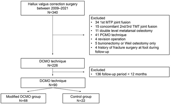 A total of 280 consecutive patients (340 feet) with hallux valgus deformities who underwent correction surgery in our institute between 2009 and 2021 were retrospectively reviewed digitally via the hospital information system. The inclusion criteria were as follows: HVA > 15 degrees, persistent forefoot pain even after at least six months of conservative treatment, and age over 20. The exclusion criteria were as follows: first metatarsophalangeal joint fusion, concomitant second or third tarsometatarsal joint fusion, double-level metatarsal osteotomy, proximal chevron metatarsal osteotomy, bunionectomy or Weil osteotomy only, history of fracture surgery on the foot during follow-up, and a follow-up period of less than 12 months. Following the inclusion and exclusion criteria, the remaining patients were subsequently divided into a modified DCMO group and a control (conventional DCMO) group.
