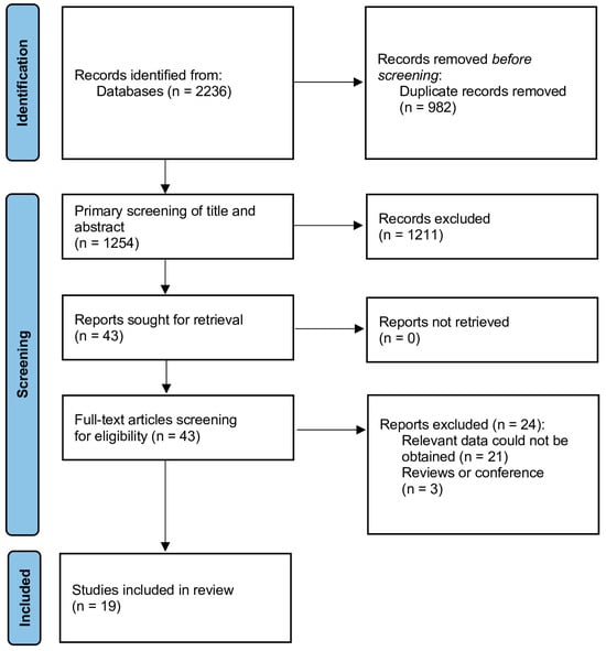 The literature search is illustrated in Figure 1. A total of 2236 records were initially retrieved. Of these, 982 duplicate publications were excluded. After an initial screening of titles and abstracts, 43 articles were selected for assessment of full texts, resulting in a further exclusion of 24 studies. Finally, a total of 19 studies were eventually included in the review (Table 1) [18,19,20,21,22,23,24,25,26,27,28,29,30,31,32,33,34,35,36]. Five prospective and fourteen retrospective studies were published from 2015 to 2023, with sample sizes between 170 and 2230. The participants were from Turkey, Pakistan, China, Poland, Indonesia, Iran, and Yemen. Results of the risk of bias assessment of individual studies can be found in Table 1. All studies were of sufficient quality to be included in the review. Additional information about the studies included in the systematic review is provided in the supplementary file (Table S2). Table S2 includes additional information on the studies: number of patients diagnosed with STEMI, NSTEMI, and UA, detailed comparative characteristics of the study group vs. control group, PLR determination (time), and information on MACE (how MACE was defined in the study).