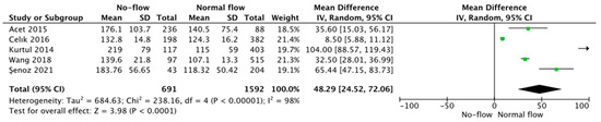 Five trials reported PLR values as related to coronary blood flow and presented the data stratified as no-flow vs. normal flow. Pooled analysis showed that PLR values were higher in those with no vs. normal flow (166.3 ± 77.3 vs. 116.5 ± 43.4, respectively, MD = 48.29; 95% CI: 24.52 to 72.06; p < 0.001; Figure 2).
