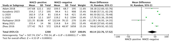 Seven studies reported PLR values in MACE-positive vs. -negative patient groups. Pooled analysis showed PLR was higher in MACE-positive (164.0 ± 68.6) than MACE-negative patients (115.3 ± 36.9; MD = 40.14; 95% CI: 22.76 to 57.52; p < 0.001; Figure 3).