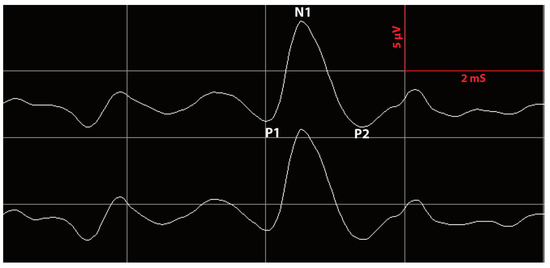 CNAP data could be collected very rapidly (3–5 s). The stimulus used was rarefaction clicks at 95 dB HL and 11 Hz, and the amplitude and latency of N1 were obtained (Figure 1) [18,19]. Forty stimuli were given per acquisition, and a minimum of two acquisitions were necessary to verify the reproducibility of the plots obtained. The amplitude and latency of N1 were collected at the brainstem as soon as the CN was identified during VS dissection in the cerebellopontine-angle (CPA), then a continuous recording of the CNAP was pursued during VS resection. At the end of the procedure, the CNAP was recorded at the brainstem, the internal auditory meatus (IAM) and the fundus. In the case of a decrease in wave amplitude by more than 50% or its complete loss during VS resection, the surgical procedure was transiently interrupted.