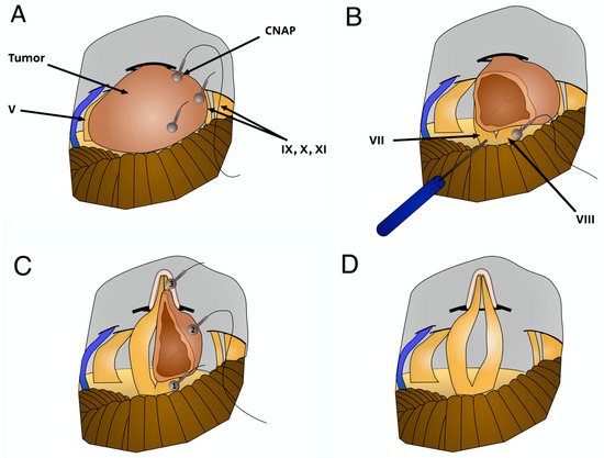 - Bernardeschi, D.; Pyatigorskaya, N.; Vanier, A.; Bielle, F.; Smail, M.; Lamas, G.; Sterkers, O.; Kalamarides, M. Role of Electrophysiology in Guiding Near-Total Resection for Preservation of Facial Nerve Function in the Surgical Treatment of Large Vestibular Schwannomas. J. Neurosurg. 2018, 128, 903–910. [Google Scholar] [CrossRef]