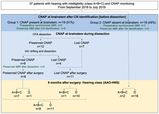 Flow chart of per-operative CNAP monitoring and hearing preservation results. ABR: auditory brainstem response; AAO-HNS: American Academy of Otolaryngology-Head and Neck Surgery; CNAP: cochlear nerve action potential; IAC: internal auditory canal.