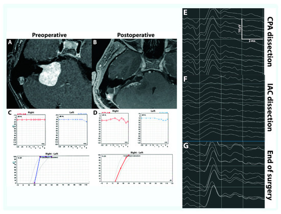 A 39–year-old woman presented with stage 4 VS of 34 mm diameter (A) with total invasion of the IAC (grade A) and hearing class A (C). There were no preoperative ABR. Resection of the VS was performed using an RS approach. After debulking and some tumor removal, there was a good CNAP amplitude of 6.8 µV at the time of cochlear nerve identification. There was no change in CNAP after tumor removal from the CPA (E). During cochlear nerve dissection from the tumor in the IAC, CNAP amplitude decreased by 50% (F). Surgery was transiently interrupted then resumed after a few minutes. At the end of surgery, there was no change in CNAP compared to the start of surgery (G). Resection of the tumor was total (B) and postoperative facial function was grade 1. Postoperative audiometry was comparable to preoperative measurements with hearing class A at 6 weeks (D).