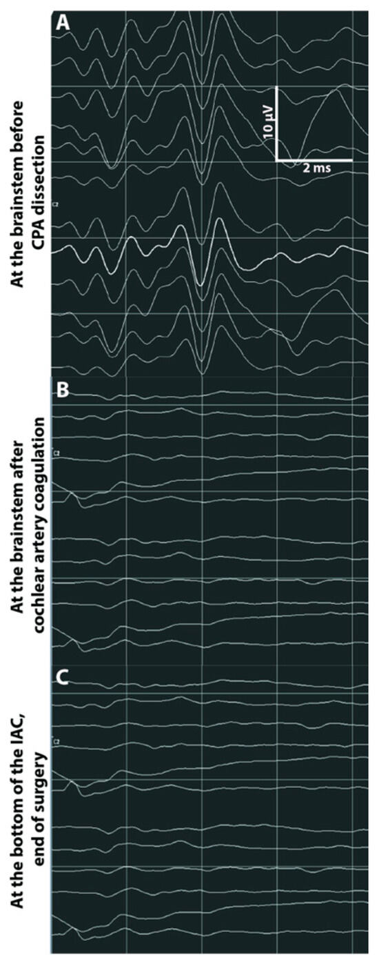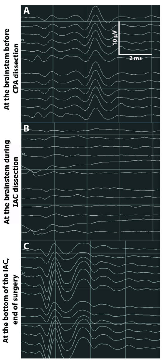 A 49-year-old woman presented with stage 4 VS of 25 mm diameter with partial IAC invasion (grade B) and preoperative hearing class A. Preoperative ABR were synchronized. It was decided to operate through a RS approach. After debulking and some tumor removal, there was a good CNAP amplitude (7.8 µV) at the time of cochlear nerve identification (A). CNAP at the brainstem was stable at the end of tumor dissection in the CPA. There was a sudden loss of CNAP at the brainstem during dissection of the cochlear nerve in the IAC (B). Despite stopping the surgical procedure for several minutes, there was no recovery of CNAP. At the end of the procedure, CNAP was absent from the brainstem but present at the IAC fundus indicating nerve conduction block (C). Resection of the tumor was total and postoperative facial function was grade 1. Postoperative audiometry confirmed anacusis despite corticosteroid treatment (hearing class D).