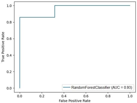 Random Forest Classifier performance illustrated with a receiver–operator curve (ROC) plot. RFC with given input variables (MPV, neutrophil count, and SII) showed a very good ability to discriminate patients with the need to perform dialysis.
