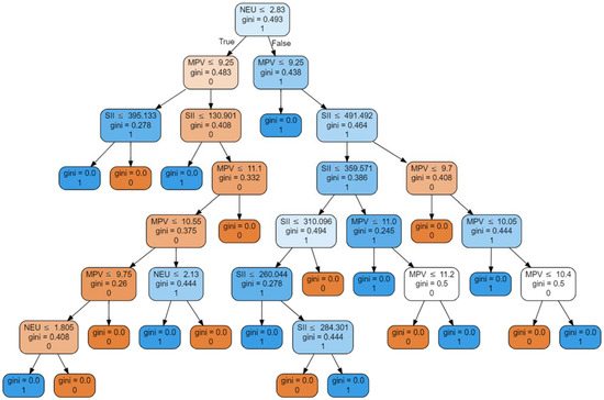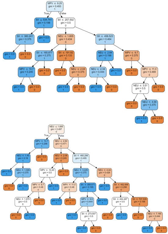 Selected decision trees from the RFC model, with serum neutrophil count, SII, and MPV as input variables, predicting need for hemodialysis. In the illustrated graphs, we move from the top node toward the right or left child of the node. Each node has a condition that, when met, means moving one level lower to the left child node. The value of Gini denotes the impurity index of the node. Each node means dividing a certain set into two, which may contain different numbers of samples marked with specific labels 0 or 1. If, after the division, we obtain a subset containing only samples with one type of label, e.g., 0, this indicator reaches the value 0.0. Each node also contains the dominant label in a given division. The partial results from all trees are collected, and the prevailing result is the final one.