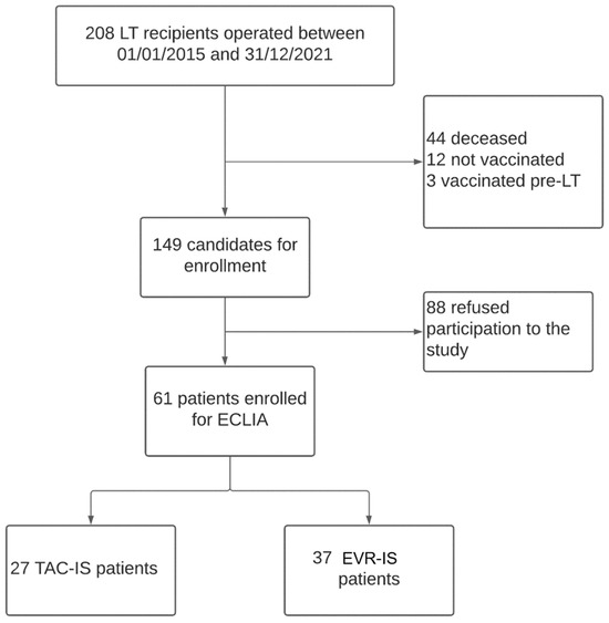All patients with available follow up who underwent LT at AOU Policlinico Tor Vergata between 1 January 2015 and 31 December 2021 were evaluated for the study. Inclusion criteria were as follows: (i) patients older than eighteen years of age who underwent LT for any underlying aetiology and had received three doses of SARS-CoV-2 vaccination with BNT162b2 (Pfizer-BioNTech) or mRNA-1273 (Moderna-NIAID) SARS-CoV-2 and (ii) patients who received de novo EVR and TAC after LT, including those who were subject to IS minimisation during their follow up in accordance with the Italian Consensus Guidelines [12]. Additionally, exclusion criteria were as follows: (i) patients diagnosed with COVID-19 before vaccination; (ii) patients who did not receive vaccination; (iii) patients who had received fewer than or more than three doses; and (iv) patients under mycophenolate.