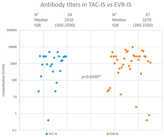 We acknowledge that this study carries some limitations. As in other similar studies, the number of participants was relatively low [23,24] and this did not allow multivariate analyses to be performed. The range of the time period between the 3rd dose and the ECLIA was also large, possibly influencing antibody titres: they may have been lower when measured early (at 30 days), having not reached a peak, or late (135 days), having already reached a plateau and started to decrease [21]. As the study included only patients taking TAC or EVR, it cannot be conclusive for patients receiving other IS regimens, such as antimetabolites and corticosteroids. Moreover, only HR, and not cellular immunity, was investigated. Most patients were on combination therapy and were assigned to the two groups based on the blood concentration. We also only analysed one time point and do not have data on changes in time; nonetheless, other studies have found that, while antibody titres seem to wean faster in LT patients, a third-dose booster delivers acceptable durability results [39,40,41,42].