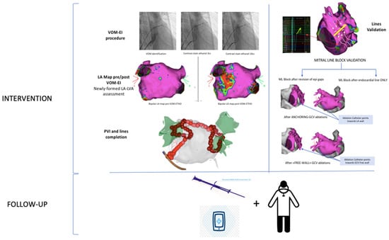Targeting the VOM with chemical ablation is also a promising and effective method of facilitating and reinforcing the lateral mitral line (ML), a critical zone of common ablation strategies in PeAF and perimitral flutters []. Indeed, alcohol infusion into the VOM facilitates a bidirectional block across the line, eliminating protected epicardial connections. Recent studies suggest that VOM ethanol infusion (VOM-EI) combined with PVI may decrease the risk of AF recurrence in PeAF patients [,], but the researchers performed coronary sinus and great cardiac vein (GCV) radiofrequency ablation, targeting epicardial muscular bundles for all patients. In our study, additional radiofrequency ablations were performed at the GCV only in presence of residual epicardial connection across the mitral line (ML) to reduce the procedural time and increase the safety of procedure. Notably, in these studies, an implantable loop recorder (ILR) was not used to reliably exclude the risk of AF recurrences. The aim of our study was to evaluate the incidence of AF recurrences by systematically using ILPSs in a PeAF population treated with a comprehensive ablation approach encompassing VOM-EI, PVI, a roofline, a mitral line (guided by the newly formed lesion after alcohol infusion into the VOM and validated by pacing), and a cavotricuspid isthmus line. Moreover, the use of a loop recorder allows for episodes of silent AF recurrences to be detected in order to clearly understand the real impact of VOM-EI in AF treatment.